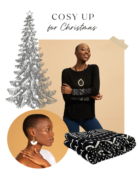 Snuggle up with your loved ones this winter in style. Pair up your new Kichana black with your Simbisi Black sweater for a bold look. If you are planning on keeping your new Zuri Earrings for yourself, we wouldn’t blame you. Add a pair to take this look to the next level.