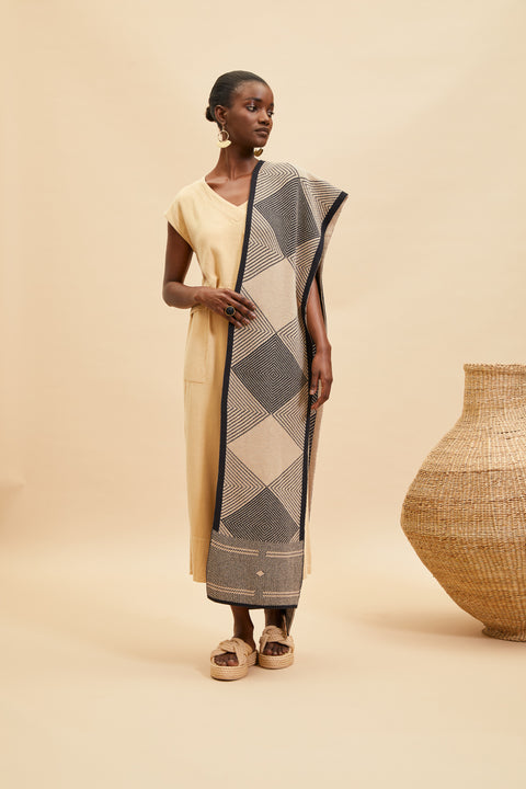 This scarf is designed in a geometric African pattern, inspired by the use of diamonds and triangles to create dynamic effects. The combination of pattern and the equal colors of sand and black creates usawa ‘balance’ . It’s reversible, versatile and a delicate take on our connection to African patterns.