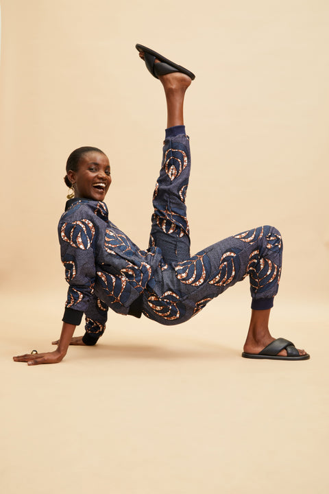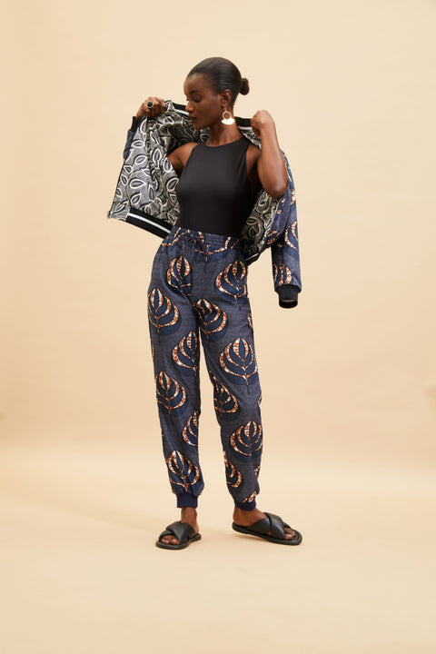 We have an undying passion for the art of matching African wax prints. The beauty of the African Wax print lies in its ability to create stunning matching sets. That's precisely why we couldn't resist pairing our exquisite Akazi Reversible Bomber Jacket in Blackleaf/Blue leaf with the lightweight and stylish Zalika designer pants.